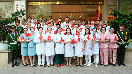 10月1日早8:00.深圳怡康醫院隆重舉行慶祝中華人民共和國成立76周年升旗儀式。全院黨員、幹部和醫護職工代表,以及參加國慶會診的深圳市婦幼保健院婦科專家、怡康技術顧問趙坤主任齊聚現場,在莊嚴的國歌聲中注視五星紅旗冉冉升起,共同表達對祖國的深切熱愛與崇高敬意。